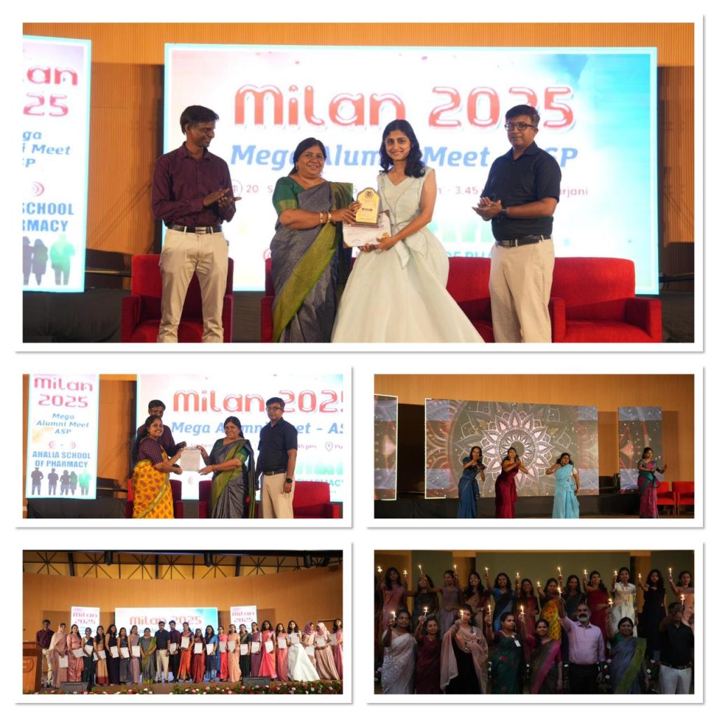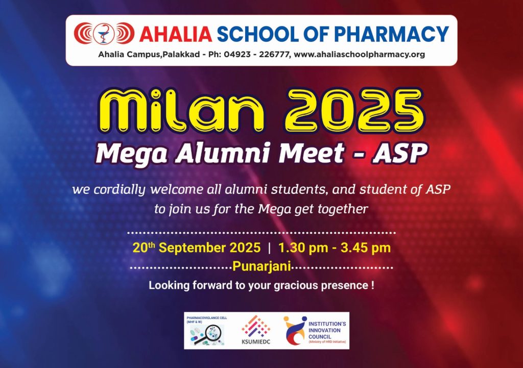 Ahalia School of Pharmacy organised Mega Alumni Meet Milan 2025 on Saturday, 20th September 2025, from 1.00 pm to 3.00 pm at Punarjani, Auditorium.The Programme was officially started with Career Guidance expert interaction with Alumni student. Ms. Prathiba, Assistant Director, Eazylink Academy & Mr. Abdul Razaack Azarudeen, Senior Manager , AECC , Coimbatore were the special invitees. They were interacted with the alumni students.Dr. Sapna Shrikumar, Principal, Ahalia School of Pharmacy has given the welcome address . Dr. Deepu S, HoD Department of Pharmaceutics felicitated the event by sharing his thoughts with alumni students.Award distribution for Alumni students were lead by Dr. Raju A, HoD Department of Pharmacology. Students were honoured by awards and appreciation certificates. Ms. Neha George has proposed vote of thanks. Ms. Kanaka V S, Associate Professor, Department of Pharmaceutics was the Master of Ceremony.Cultural programs were performed by Alumni students of Batch 2020 and batch 2019. Alumni students shared their thoughts and experiences with the audience.The program was graced by Candle light ceremony. Principal Dr. Sapna Shrikumar lightened tha lamp and all teachers and alumni’s joined the function.That was followed by DJ party and photograph session. The program was a resounding success.