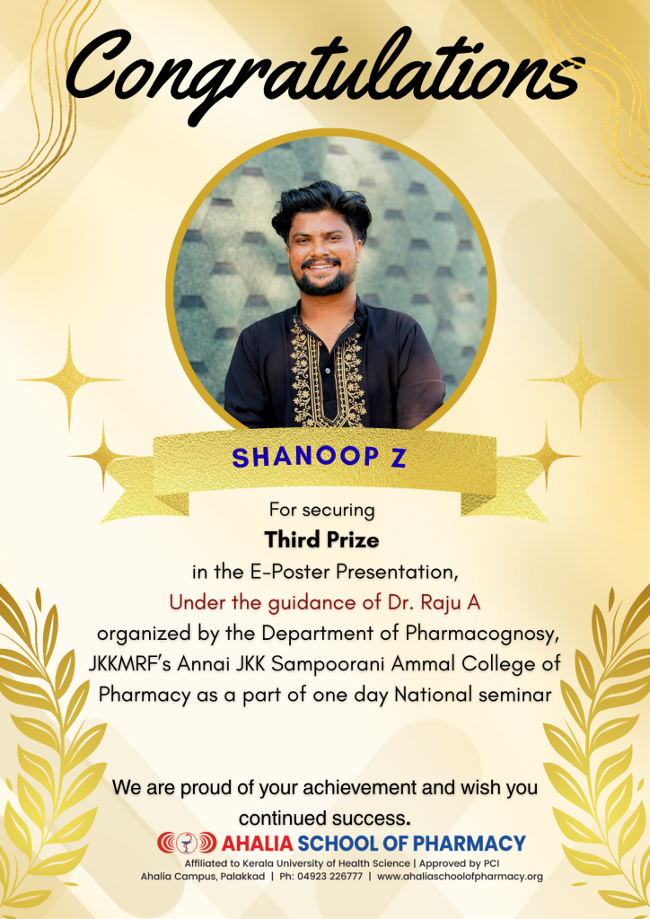 Shanoop Z secured the Third Prize in the E-Poster Presentation category.