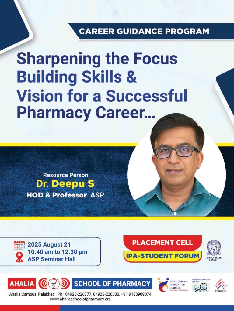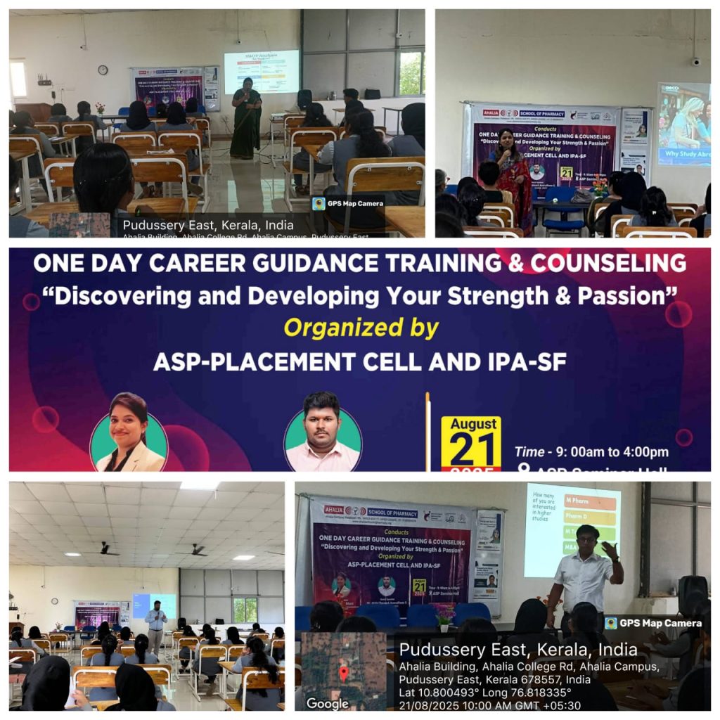 A one-day Career Guidance Training and Counseling Program was successfully organized by the ASP Placement Cell in collaboration with IPA-Student Forum on 21st August 2025 at ASP seminar hall. The event was aimed at equipping pharmacy students with insights and direction for building a successful professional career, both in India and abroad.