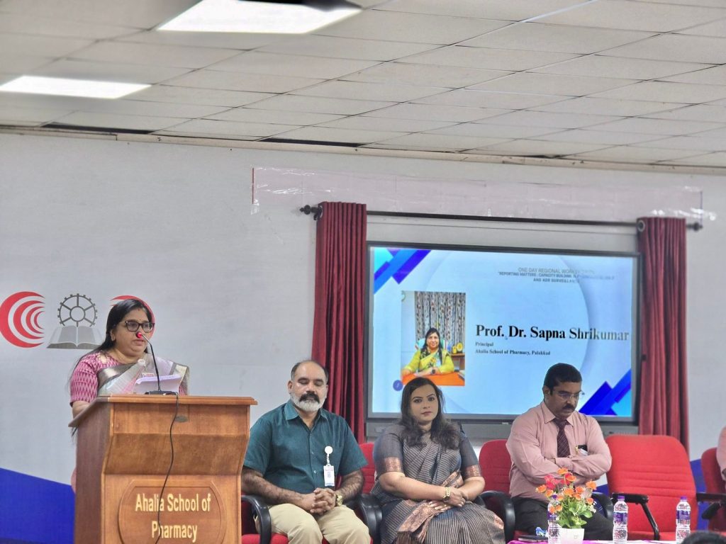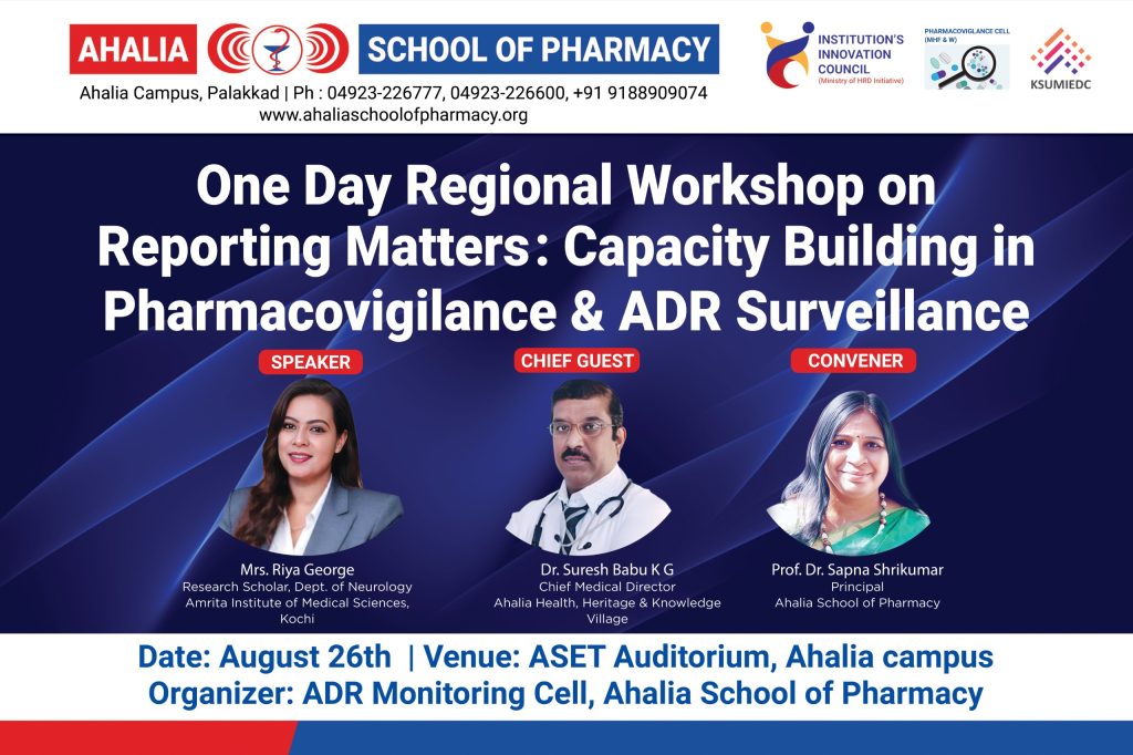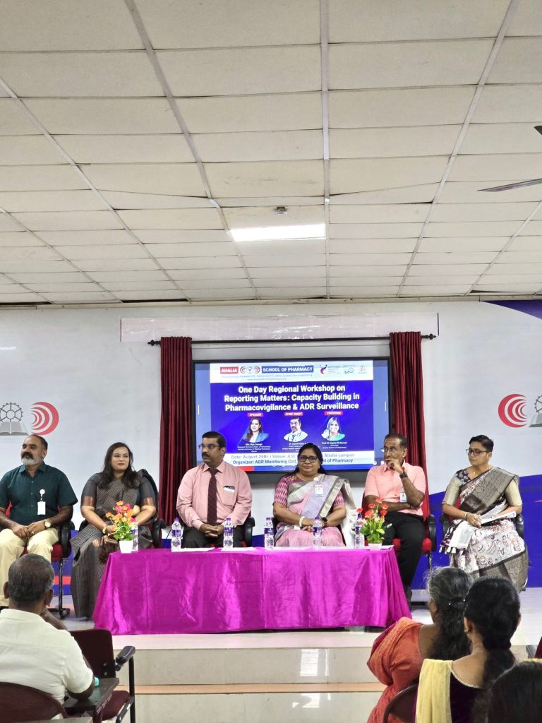 Ahalia School of Pharmacy organized a One Day Regional Workshop on “Reporting Matters: Capacity Building in Pharmacovigilance & ADR Surveillance” on 26th August 2025 at the ASET Auditorium. The workshop aimed to create awareness and strengthen the knowledge and skills of students and healthcare professionals in pharmacovigilance and adverse drug reaction (ADR) reporting, thereby contributing to patient safety.